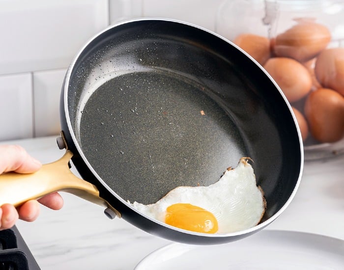 Our latest shade of blue is gold! This collection is our most radical reinvention of nonstick cooking delivering incomparable release, ultra-fast heating, and incredible results. The gold-tone handles feature wear-and corrosion-resistant coating for a shine that’s made to last. Our ceramic nonstick coating is not only infused with diamonds for extra durability but is PFAS-free for worry-free meals.