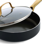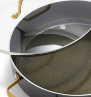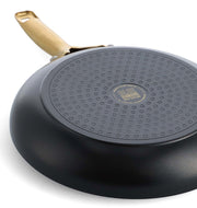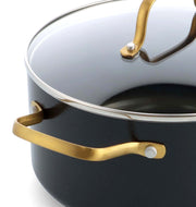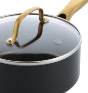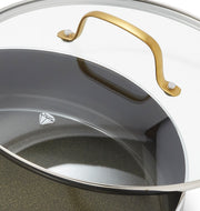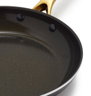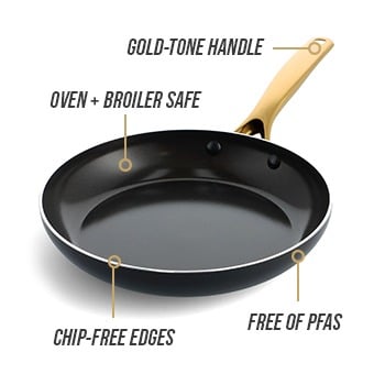 Our latest shade of blue is gold! This collection is our most radical reinvention of nonstick cooking delivering incomparable release, ultra-fast heating, and incredible results. The gold-tone handles feature wear-and corrosion-resistant coating for a shine that’s made to last. Our ceramic nonstick coating is not only infused with diamonds for extra durability but is PFAS-free for worry-free meals.